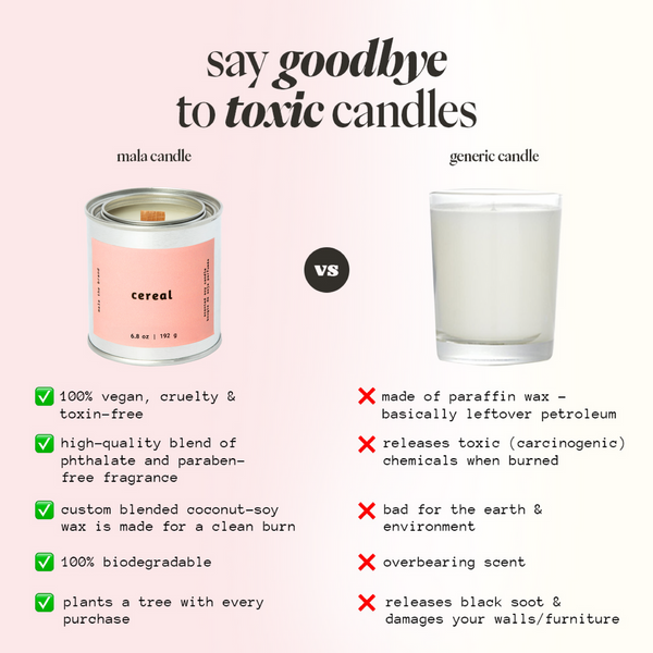 ~ custom blended coconut-soy wax is made to burn cleanly (meaning it doesn't create harmful, black soot like paraffin candles do) and is 100% biodegradable, free from toxins, made from vegetables and a renewable source