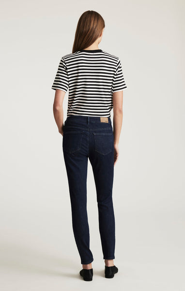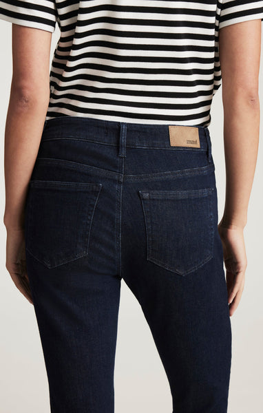 Tess is a modern high rise with a super-skinny leg. The contemporary fit is often finished in an ankle length. This pair is finished in a midnight blue rinse wash.