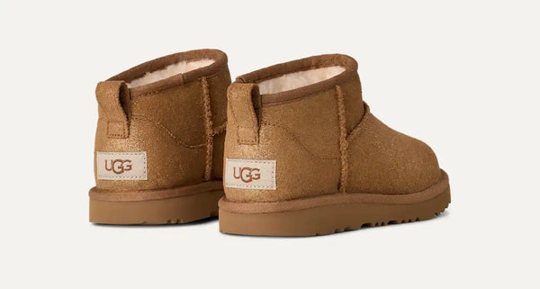 Our Classic Ultra Mini Dazzle is a shimmering take on one of our fan favorites. This Classic features everything kids love about the original: a signature UGGplush™ lining and insole, and a flexible, ultra-lightweight sugarcane EVA outsole — now in a dazzling print. It also features a low shaft height, adding easy on-off and enhanced versatility.