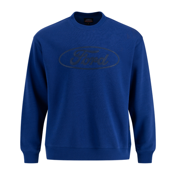 Stay comfortable in the Ford x Brixton Number One Fleece Crewneck Sweatshirt, perfect whether you're by the beach or behind the wheel. Made from medium weight recycled fleece (300GSM) with 77% cotton and 23% recycled polyester, it features classic center front chain stitch embroidery, a cool embroidered sleeve detail, and a side seam label for a timeless look and cozy feel. This is your next cool blue crewneck.