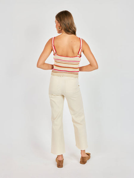 Add a pop of color and texture to your wardrobe with this vibrant striped Copper Cloud Sweater Tank. Combining warm earth tones with bright accents, this top features a detailed knit that feels both nostalgic and fresh.