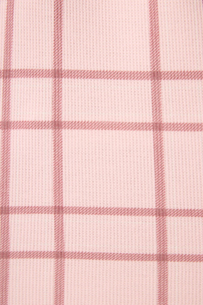 Women’s pink plaid pajama set with long-sleeve top and boxer shorts. Made from soft baby peachy waffle-knit fabric with relaxed fit.