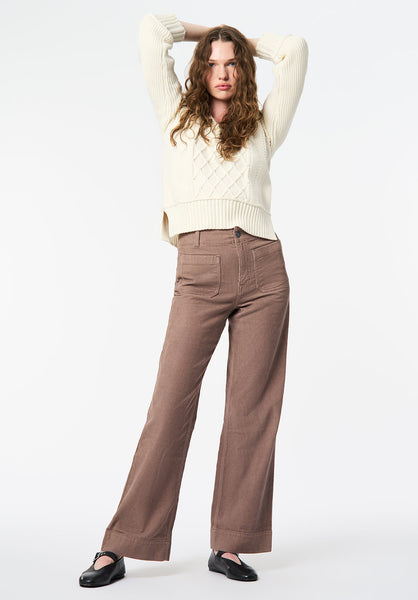 Elevate your everyday look with this cozy yet stylish V-neck sweater Colette, crafted in a rich cable knit pattern that adds dimension and warmth. The relaxed silhouette and wide ribbed hem create a flattering, easygoing fit, while the textured diamond stitching gives it a timeless, elevated touch. Made from a soft, plush knit, it's the perfect layering piece for cooler weather.