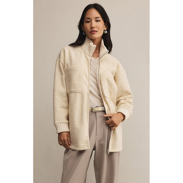 This cream zip-up jacket is the perfect mix of comfort and minimal style. Crafted from a soft, textured fabric, it features a ribbed high collar, front zipper closure, and oversized patch pockets for a casual yet elevated vibe. The relaxed fit and ribbed cuffs make it a versatile layering piece you’ll reach for all season long.