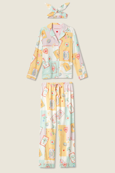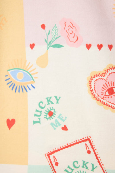 Sleep, lounge, repeat in this dreamy three-piece flannel set with a whimsical, luck-inspired twist. Made from soft cotton in a classic twill weave, it includes a button-up shirt, relaxed-fit pants, and a matching headband. The patchwork-style design blends soft ivory, pastel mint, peach, and lilac, scattered with playful motifs—lucky playing cards, eye talismans, radiant hearts, blooming flowers, and “Lucky Me” script—for a look that’s as charming as it is cozy.