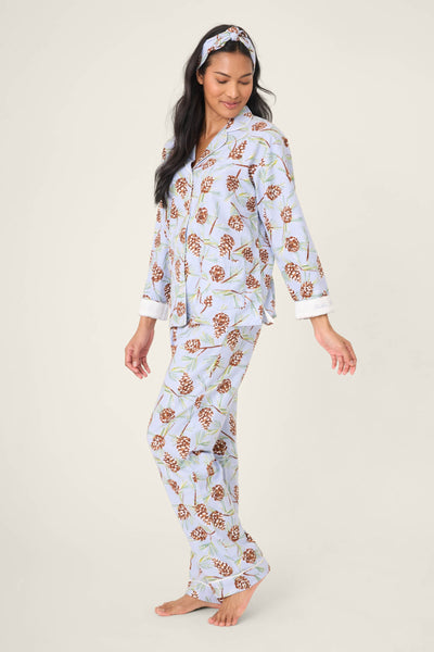 - Women’s blue flannel pajama set with pinecone print, button front top, drawstring pants, and matching headband.