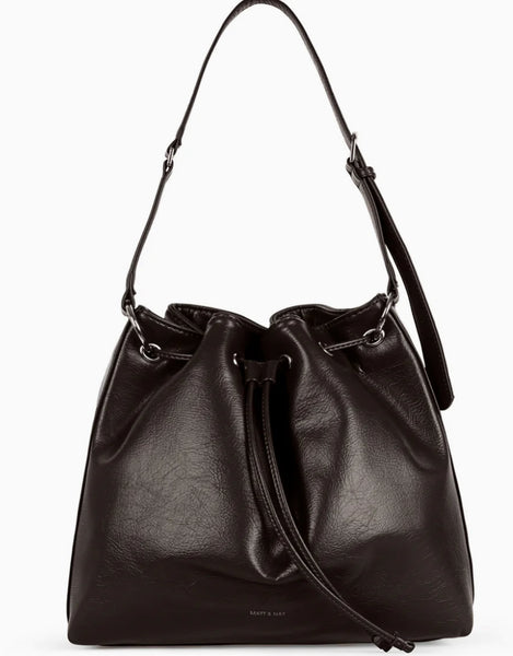 A large slouchy bucket bag with a drawstring closure, an adjustable shoulder strap, and internal pockets.