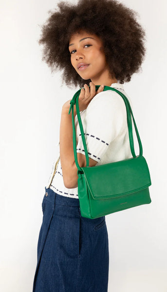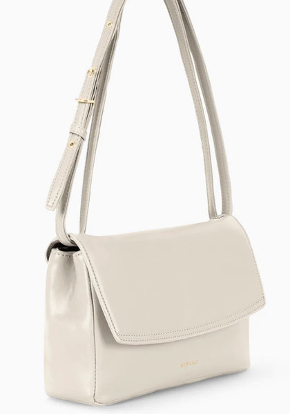 A crossbody bag that can convert into a shoulder bag, flap closure, internal compartments including a center zippered compartment, and an exterior back pocket with a magnetic snap closure.