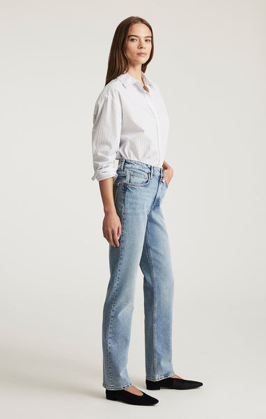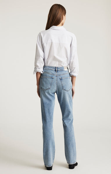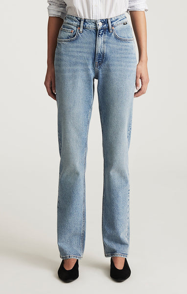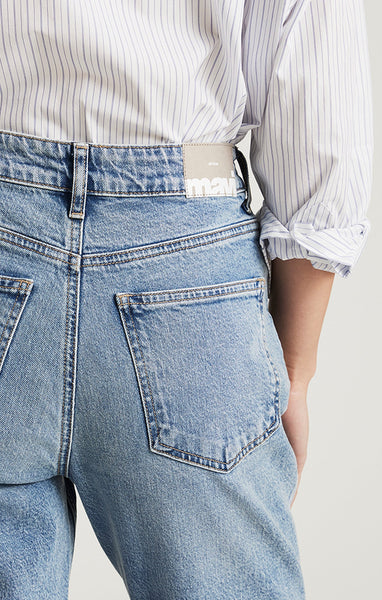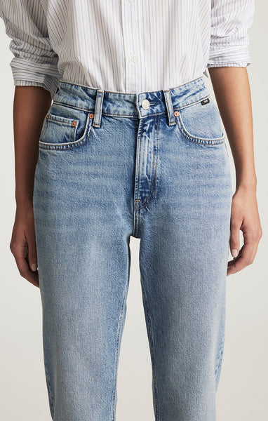 New York offers a more streamlined take on the straight leg, featuring a slightly narrower fit through the leg. The effortless style has a flattering high rise and cropped length. This pair comes in a classic blue wash with vintage-inspired tonal coloring.
