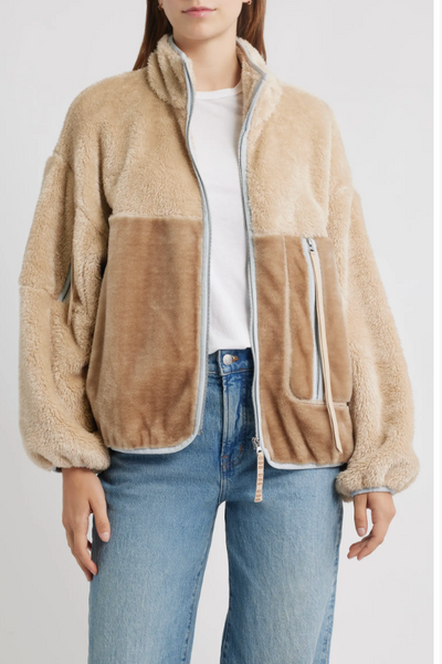 - Oversized-fit full-zip plush fleece and faux fur blocked jacket