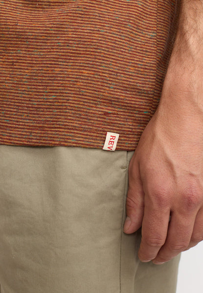 Regular-fitted t-shirt with a round neck and short sleeves, made in a small seasonal striped pattern in mélange organic cotton-jersey, with a weight of 160gsm. The finishing of the t-shirt adds softness and ensures stability and durability to the style. The t-shirt features a ribbed collar and is finished with a twin needle stitched hem and cuffs