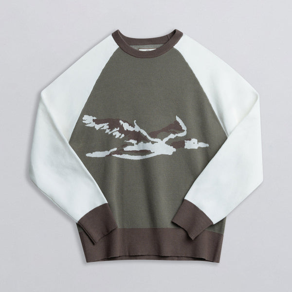 Celebrate nature in motion with this standout knit featuring an 8 bit flying duck graphic across the chest. With contrasting raglan sleeves and a muted earth-tone palette, it’s crafted from a soft cotton blend for everyday comfort and warmth. Finished with ribbed trims for a clean, structured fit.