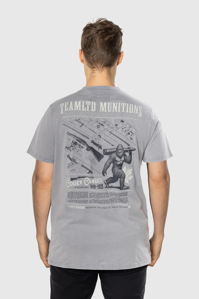 Heritage meets hilarity in the Munitions Tee—a tribute to high-powered nonsense and low-key legends. Featuring a rifle schematic you probably won’t read and a Sasquatch locked and loaded, this tee is washed for a vintage feel and built for maximum storytelling. Left chest and full-back prints add just enough mystery to make people ask questions you can’t answer.